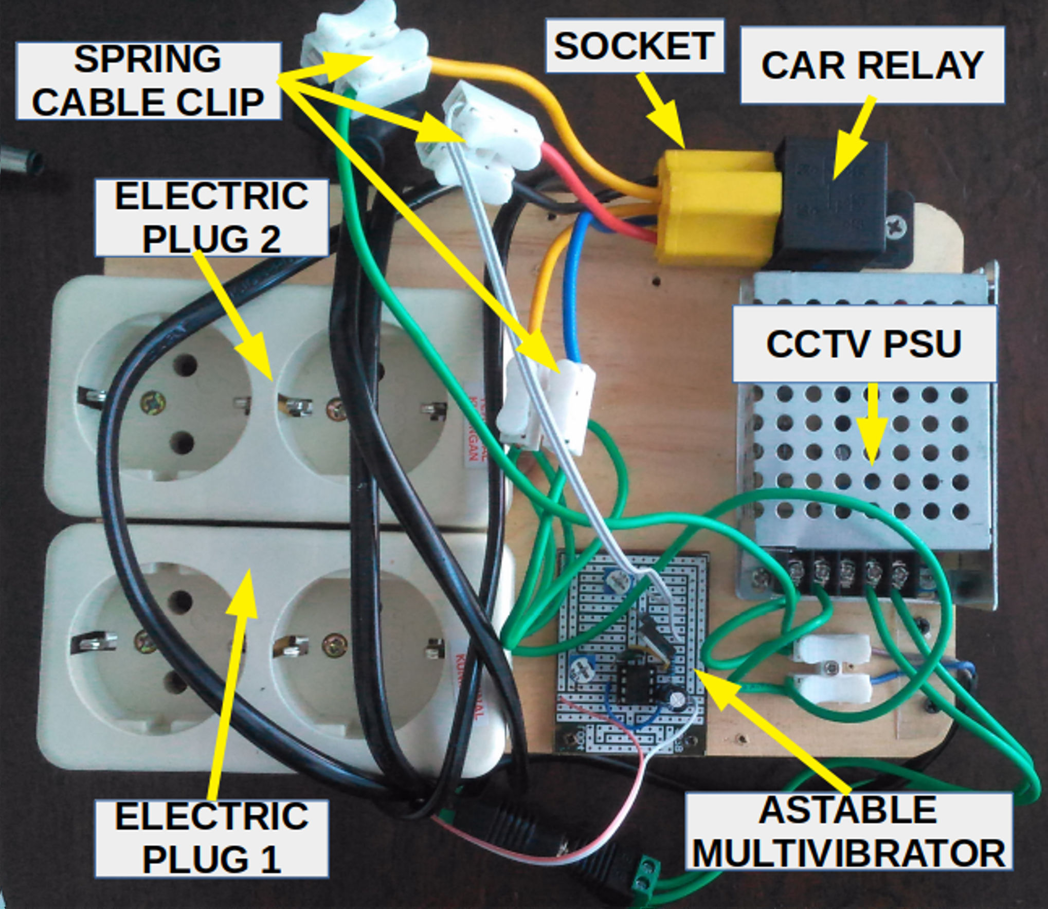 power up the circuit. The car relay is securely placed on the chopping board with a socket attached